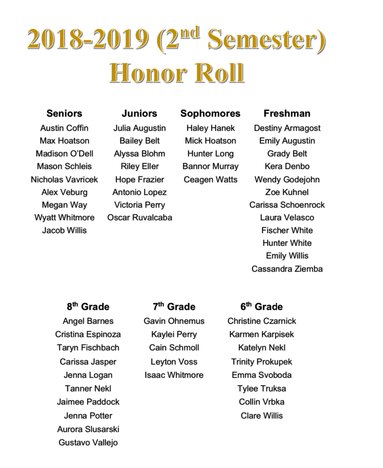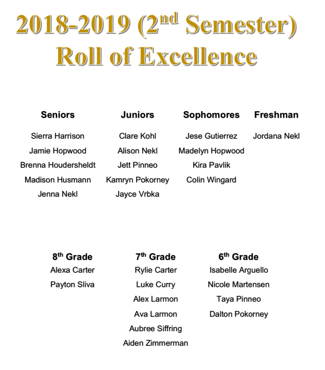 Middle School and High School Announce Second Semester Honor Roll and Roll of Excellence